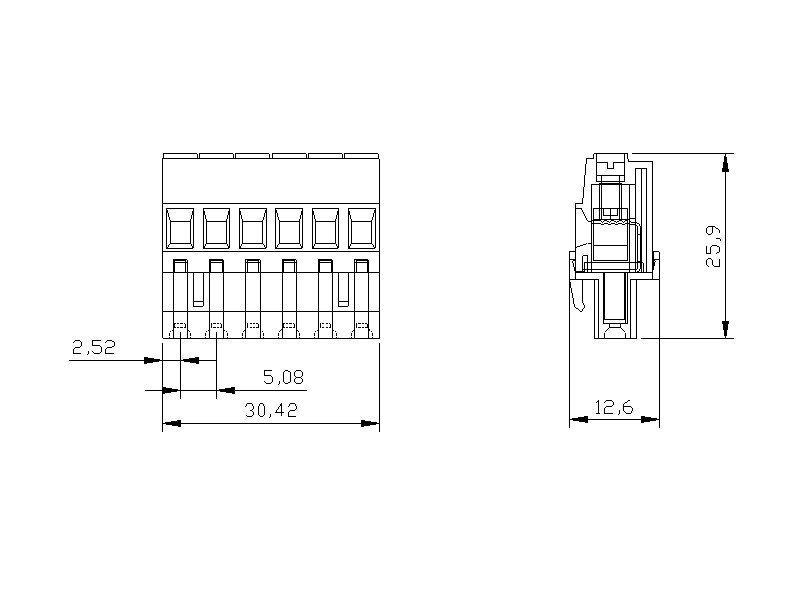 PCB terminal block with screw connection socket with elevator mechanism6 polesMax. conductor cross section: 2.5mm²-14 AWGPin spacing: 5.08mmRated voltage: 250VRated current: 16A