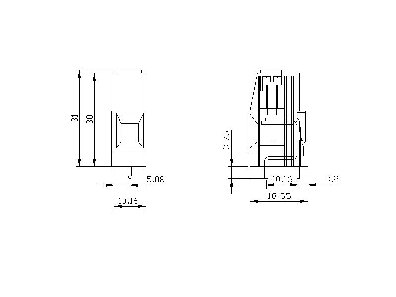 Asansör mekanizmalı vida bağlantılı modüler PCB klemensi2 kutupMax. iletken kesiti: 4mm²-12 AWGPim aralığı: 5,08mmNominal gerilim: 250VNominal akım: 25A