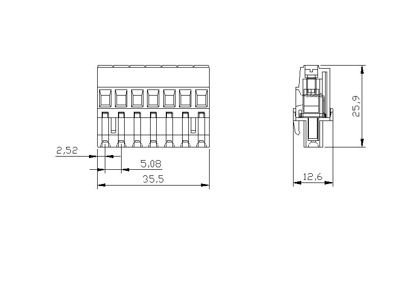 Asansör mekanizmalı vida bağlantılı soketli PCB klemensi7 kutupMax. iletken kesiti: 2,5mm²-14 AWGPim aralığı: 5,08mmNominal gerilim: 250VNominal akım: 16A